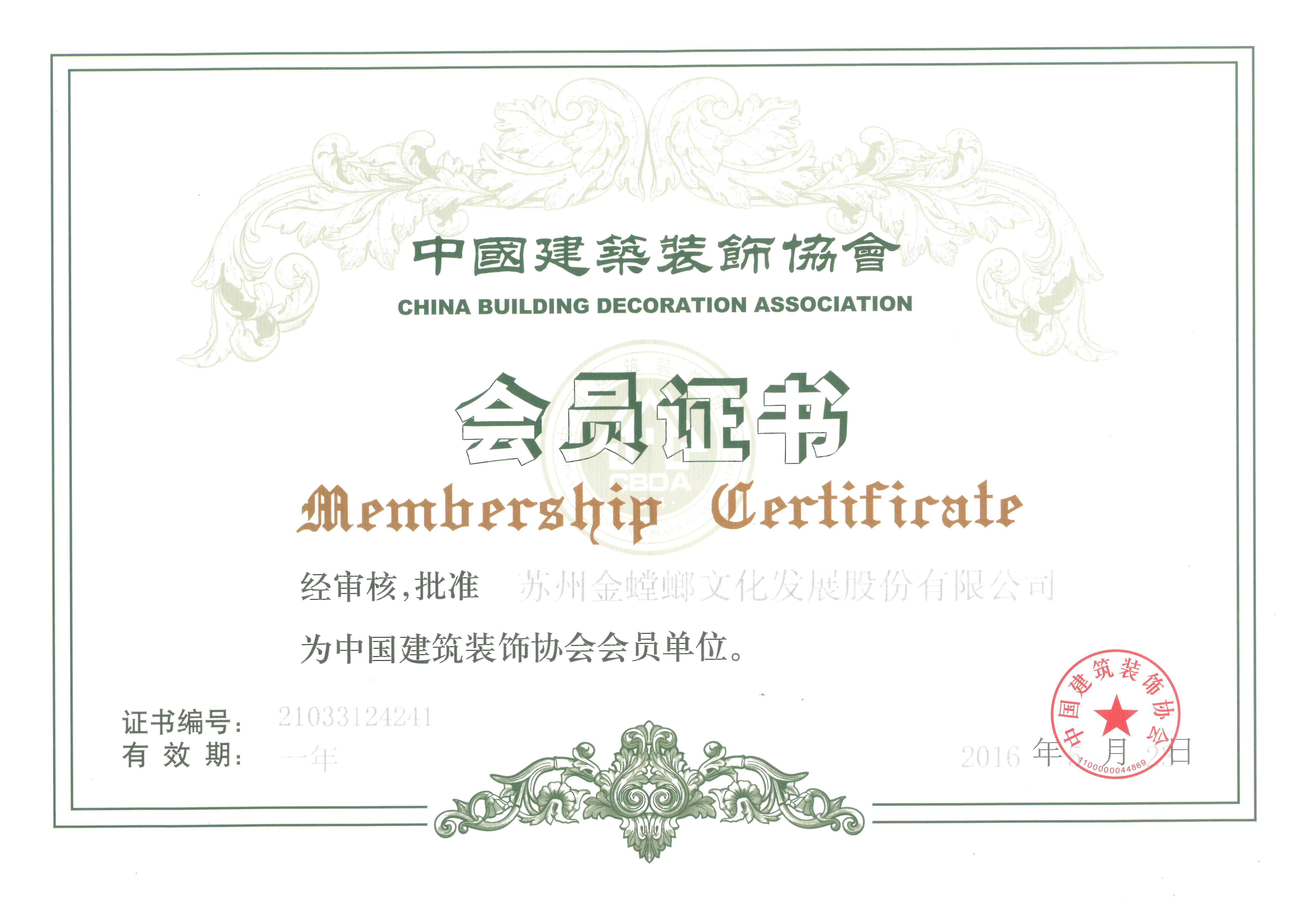 中國(guó)建筑裝飾協(xié)會(huì)會(huì)員證書