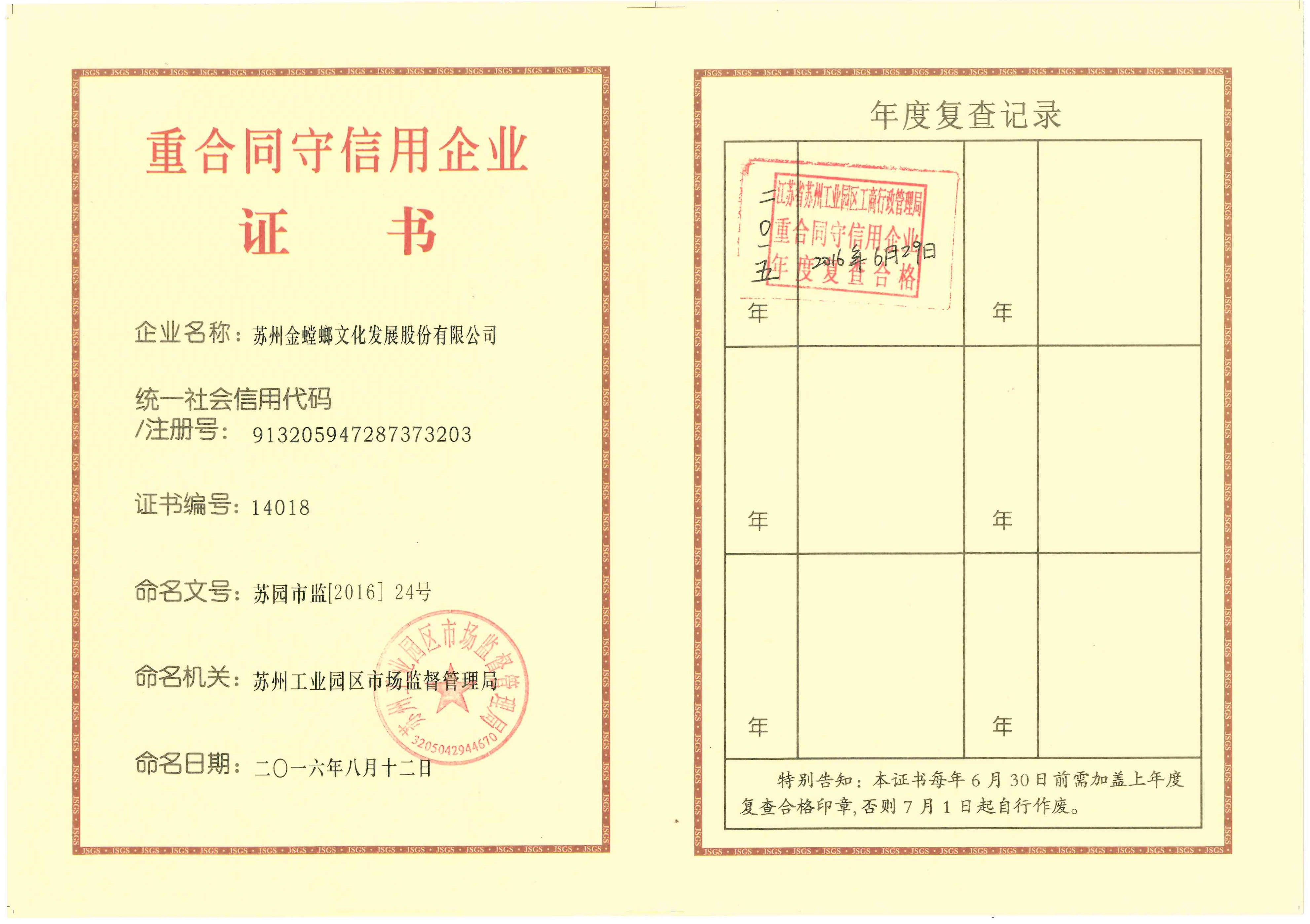 重合同守信用企業(yè)證書