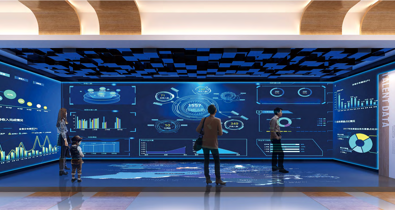 展廳引用習近平總書記十九大報告中“以識才的慧眼、愛才的誠意、用才的膽識、容才的雅量、聚才的良方,把黨內和黨外、國內和國外各方面優秀人才集聚到黨和人民的偉大奮斗中來。”一句話貫穿整個廳;以人才為核心,吸引人才、服務人才、留住人才等角度打造智慧人才展廳。