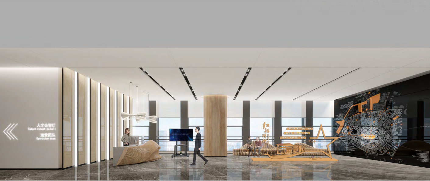 由金螳螂文化擔任設計與施工的浙江長三角人才大廈項目,位于嘉興市南湖區國際金融廣場金融大廈B座的21、22和23層,每層約1700平方米。其中21層是長三角人才項目集聚區;22層是長三角企業集聚區、高校聯合會、協會集聚區;23層是長三角人才數字展示中心、長三角人才會客廳、人才驛站、公共服務信息平臺、嘉興長三角人才發展研究院、運營公司,展廳主要分為兩個區域,功能區和展示區。