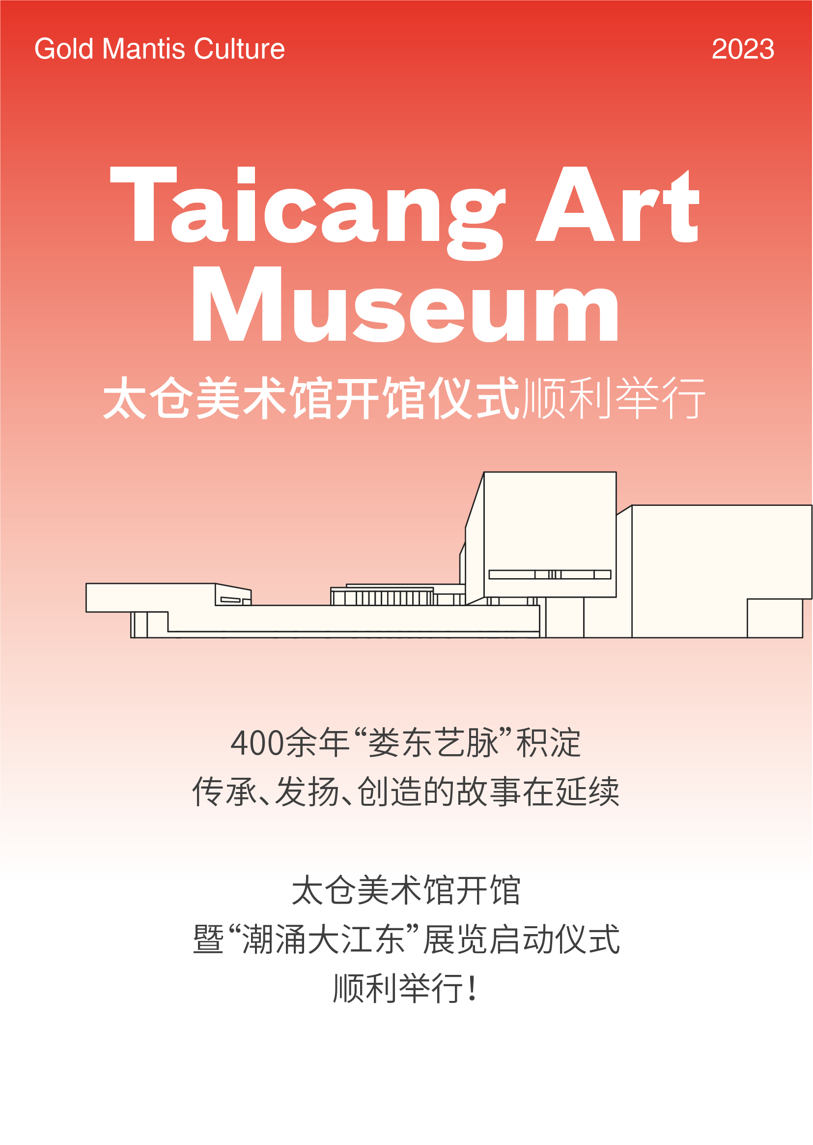 2月8日下午,太倉美術(shù)館開館暨“潮涌大江東”展覽啟動(dòng)儀式舉行。金螳螂文化作為太倉美術(shù)館展陳出品單位參與啟動(dòng)儀式。 中國對(duì)外文化集團(tuán)黨委書記、董事長(zhǎng)李金生,全國政協(xié)委員、中國美協(xié)策展委員會(huì)副主任、北京畫院院長(zhǎng)吳洪亮,太倉市委書記汪香元,市委副書記、市長(zhǎng)胡衛(wèi)江,市委副書記徐志強(qiáng),市人大常委會(huì)主任王紅星,市政協(xié)主席趙建初等市四套班子領(lǐng)導(dǎo)出席活動(dòng)。 △ 金螳螂文化董事長(zhǎng)楊震受邀參與太倉美術(shù)館開館儀式 現(xiàn)代美學(xué)與園林雅致交融 太倉美術(shù)館新館 總建筑面積約1.65萬平方米 延續(xù)了清代太倉園林的空間結(jié)構(gòu) 營(yíng)造園林式的觀感體驗(yàn) 以藝術(shù)化的設(shè)計(jì)傳達(dá)空間美感,為藝術(shù)展覽提供適宜棲所。 根據(jù)美術(shù)館對(duì)于油畫展、書畫展、主題文化展、當(dāng)代藝術(shù)展等內(nèi)容的展示需求,金螳螂文化項(xiàng)目團(tuán)隊(duì)定制了七個(gè)展廳空間。 “潮涌大江東——太倉美術(shù)館開館展”由太倉市人民政府和中國對(duì)外文化集團(tuán)共同主辦,共分為5個(gè)單元,分別是“鑄魂新時(shí)代——當(dāng)代藝術(shù)名家邀請(qǐng)展”“高山仰止——婁東畫派精品展”“世紀(jì)經(jīng)典——二十世紀(jì)中國畫藝術(shù)大師作品展”“藍(lán)色回響——‘一帶一路’藝術(shù)交流展”“平遠(yuǎn)?音色?構(gòu)成——德國繪畫藝術(shù)作品展”。 400余年傳承的“婁東藝脈”,隨著專業(yè)現(xiàn)代的太倉美術(shù)館開館將迎來一個(gè)新的起點(diǎn),成為向世界展示和推介太倉,鞏固和拓展太倉對(duì)外交流合作的一張新名片。 金螳螂文化有幸參與“潮涌大江東——太倉美術(shù)館開館展”的建設(shè),以專業(yè)的項(xiàng)目設(shè)計(jì)實(shí)施助力太倉美術(shù)館順利開館,以敬業(yè)的精神持續(xù)探索文化展示行業(yè),愿做文化與藝術(shù)的傳播者。 新聞素材來源:太倉美術(shù)館